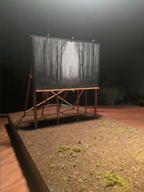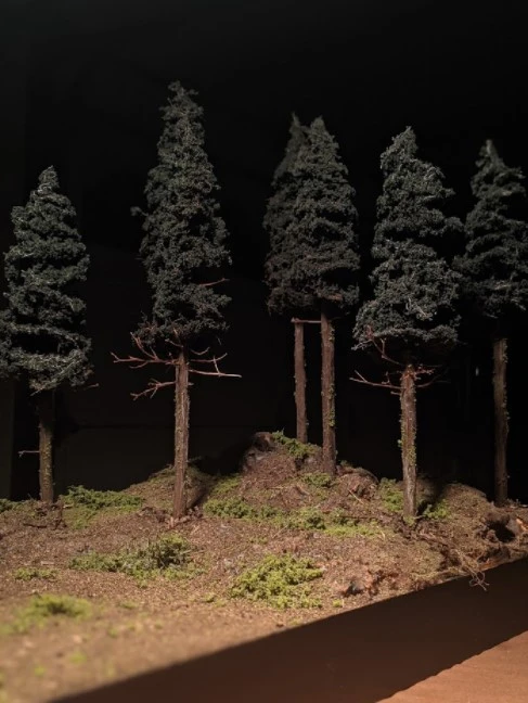 2021, 37"x 13"x 13" Wood, acrylic, styrene, coconut basket, twigs, dirt, flock, dowels, led lights, gesso, watercolor, pastel, basswood, plaster, roots